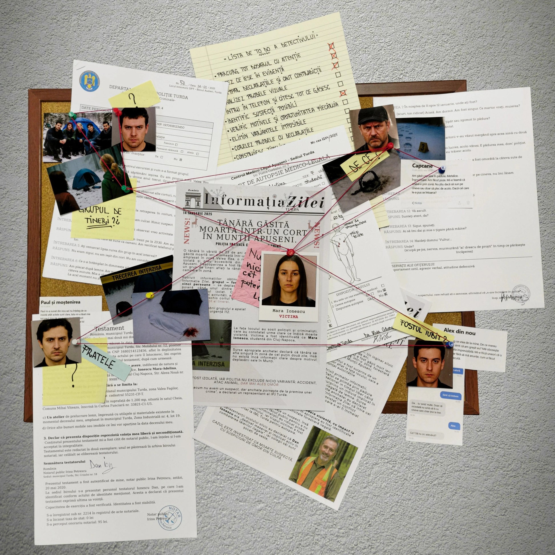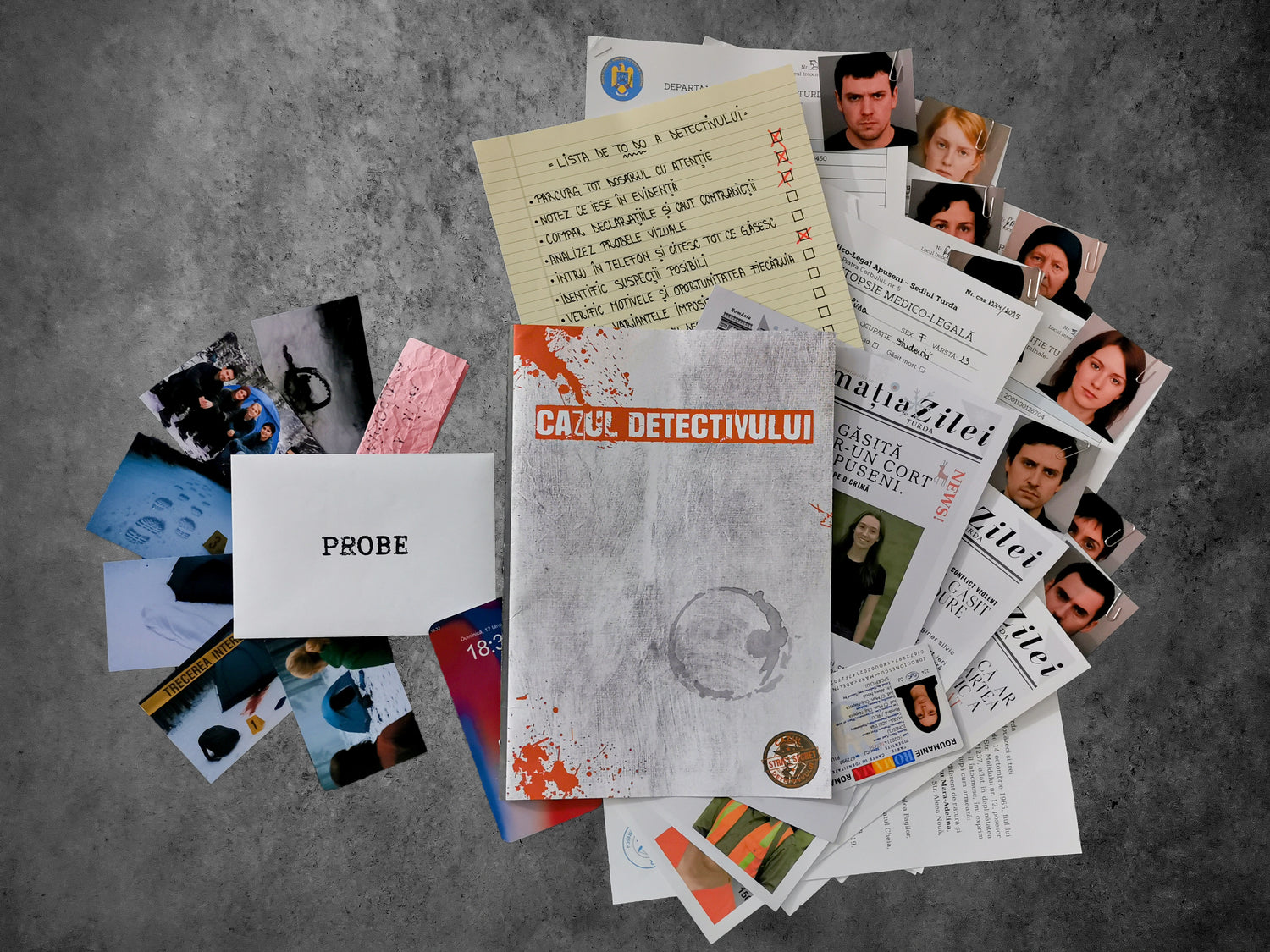 Cazul vine sub forma unui dosar fizic complet, conceput să reproducă cât mai fidel o investigație reală. Fiecare element are un rol clar și face parte din mecanica anchetei.